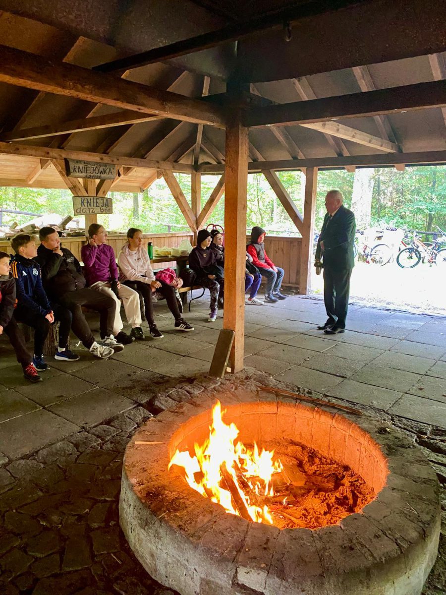 Kolejnego dnia odbyły się dwa wydarzenia. Rano odwiedziliśmy Państwową Szkołę Podstawową w Wawelnie, prowadząc lekcję dla ponad trzydziestu dzieci z klas I-III, a następnie Kolega Bronisław spotkał się z dwudziestoma uczniami klasy VI z Państwowej Szkoły Podstawowej w Dąbrowie, którzy rowerami przyjechali do wiaty w Siedliskach. Klasy I-III to niezmiennie ogromny entuzjazm i zaangażowanie dzieci – każdy bowiem przynosi ze sobą cały plecak opowieści na temat zwierząt: o kunie mieszkającej u babci na strychu i o sarnach żyjących za płotem. Staraliśmy się pomóc w usystematyzowaniu wiedzy o zwierzynie łownej oraz pokazać czym zajmują się myśliwi. Udało nam się również wprowadzić nową tradycję do spotkań przy wiacie i wspólnie z dziećmi oddaliśmy hołd Kolegom, którzy odeszli do krainy wiecznych łowów.