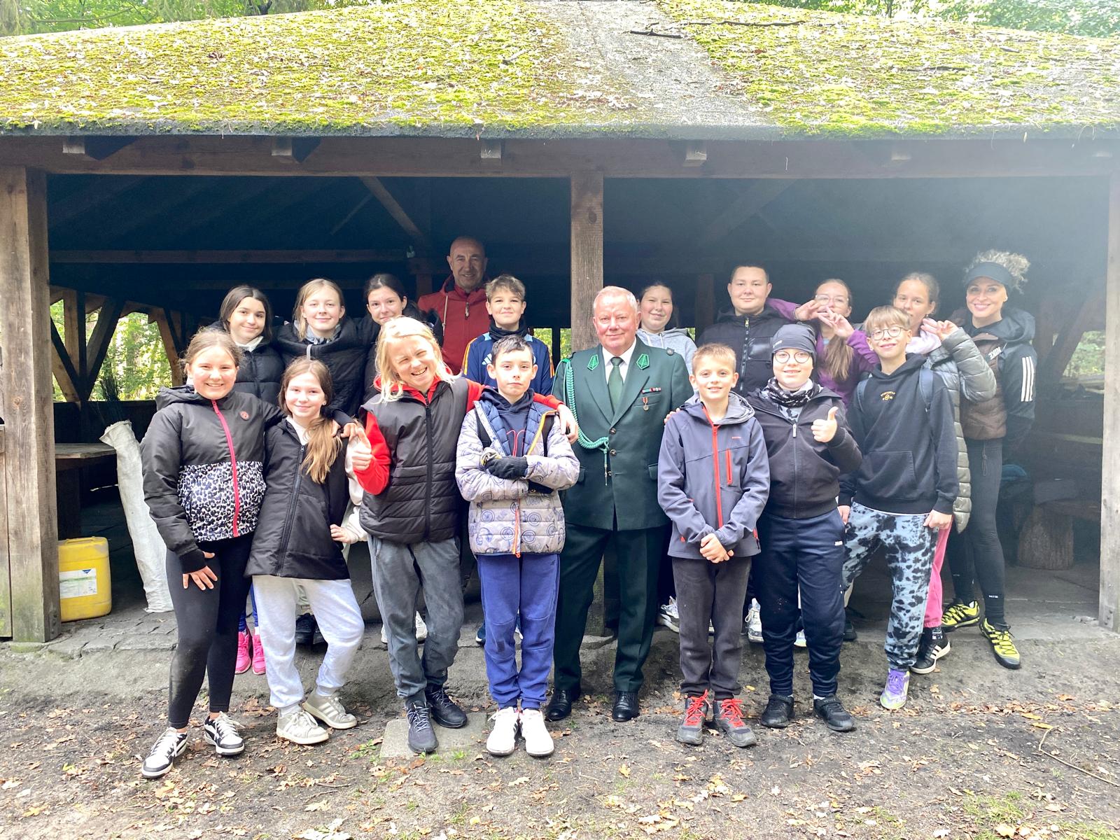 25 września gościliśmy w Kniejówce dwudziestu jeden uczniów klasy VII z Państwowej Szkoły Podstawowej w Dąbrowie.  Zimny wiatr na szczęście nie przeszkodził w zaplanowanym spotkaniu i młodzież przyjechała do nas rowerami. Podczas lekcji opowiadaliśmy o naszym Kole oraz przybliżyliśmy czym zajmują się myśliwi w naszym łowisku. Potem przyszła pora na sprawdzenie wiedzy o zwierzętach żyjących w naszych lasach i niestety okazało się, że lekcja o zwierzynie jest konieczna. Mamy nadzieję, że młodzież na długo zapamięta różnice pomiędzy sarną i jeleniem. Staraliśmy się także pokazać dzieciom na czym polega polowanie zbiorowe oraz czym są tradycja i etyka łowiecka. Niezmiennie najciekawszy moment dla wielu dzieci to możliwość dotknięcia eksponatów, podczas którego padają pytania Czy to jest prawdziwe?  Dostatecznie dobra aura pozwoliła nam zrealizować plan spotkania do końca i po części teoretycznej przenieśliśmy się pod wiatę, chłopcy rozpalili ognisko i zjedliśmy pyszne kiełbaski.